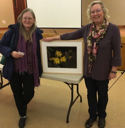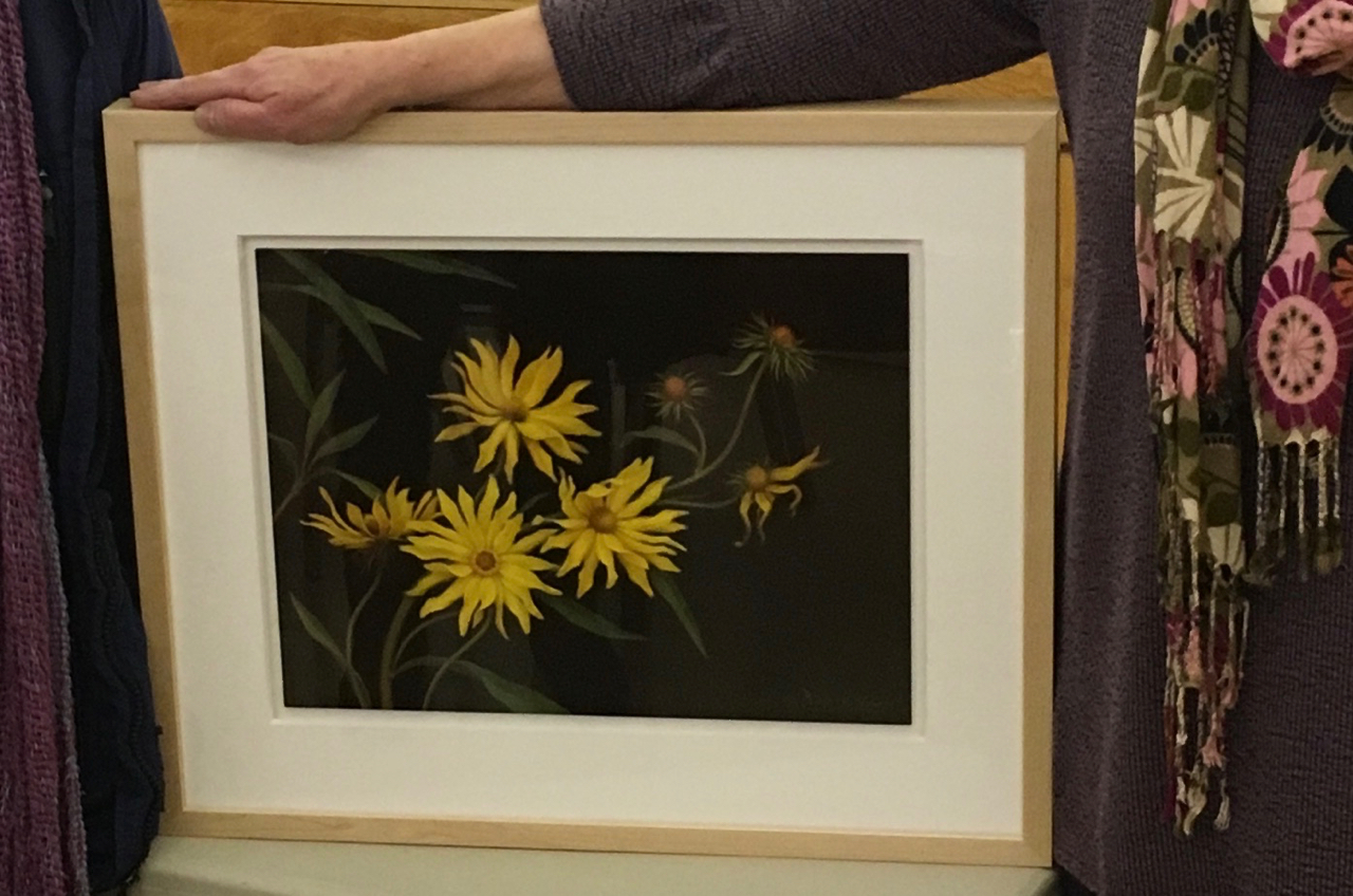 After a break, Kerri showed some slides of her own work, briefly illustrating how her style has developed from a more English-modern style – watercolour against a pale, unpainted background — to her current work in oil paint. She, too, likes to position, among her flowers, appropriate pollinators, of which the arbiters of botanical art correctness do not always approve. Kerri brought a few of her absolutely gorgeous canvases to the talk, including one of some yellow daisy-style flowers. Eying the yellow daisies picture, propped on an easel, for the duration of Kerri’s talk, I kept thinking, “That looks a lot like Maximilian’s Sunflower.” Sure enough, when she came to talk about that canvas, Maximilian’s Sunflower (Helianthus maximiliani) was the species she had so beautifully and realistically painted. Kerri kindly gave a word of appreciation to Beaux Arbres, for supplying the plant she painted, and praised the October-blooming Maximilian’s Sunflower for attracting a host of pollinators.