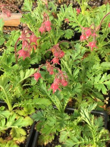 (Geum triflorum) The nodding pink flowers of Prairie Smoke emerge very early. The most noticeable part of the flowers, the crazy pink jesters’ caps, are sepals; the actual flower is a cream or pale pink flask, within the jester’s cap, that never opens. Bumblebees force themselves into the centre of the flower to pollinate it. As the flowers fade, they turn and face upwards, and the ripening seeds extend a mist of smoky purple-grey. Hence the name. The leaves of Prairie Smoke persist into the fall and green up early in the spring. Prairie Smoke will slowly fill in but it does not run about. Its low, tidy habit and two seasons of interest make this a very popular choice for the front of a border.