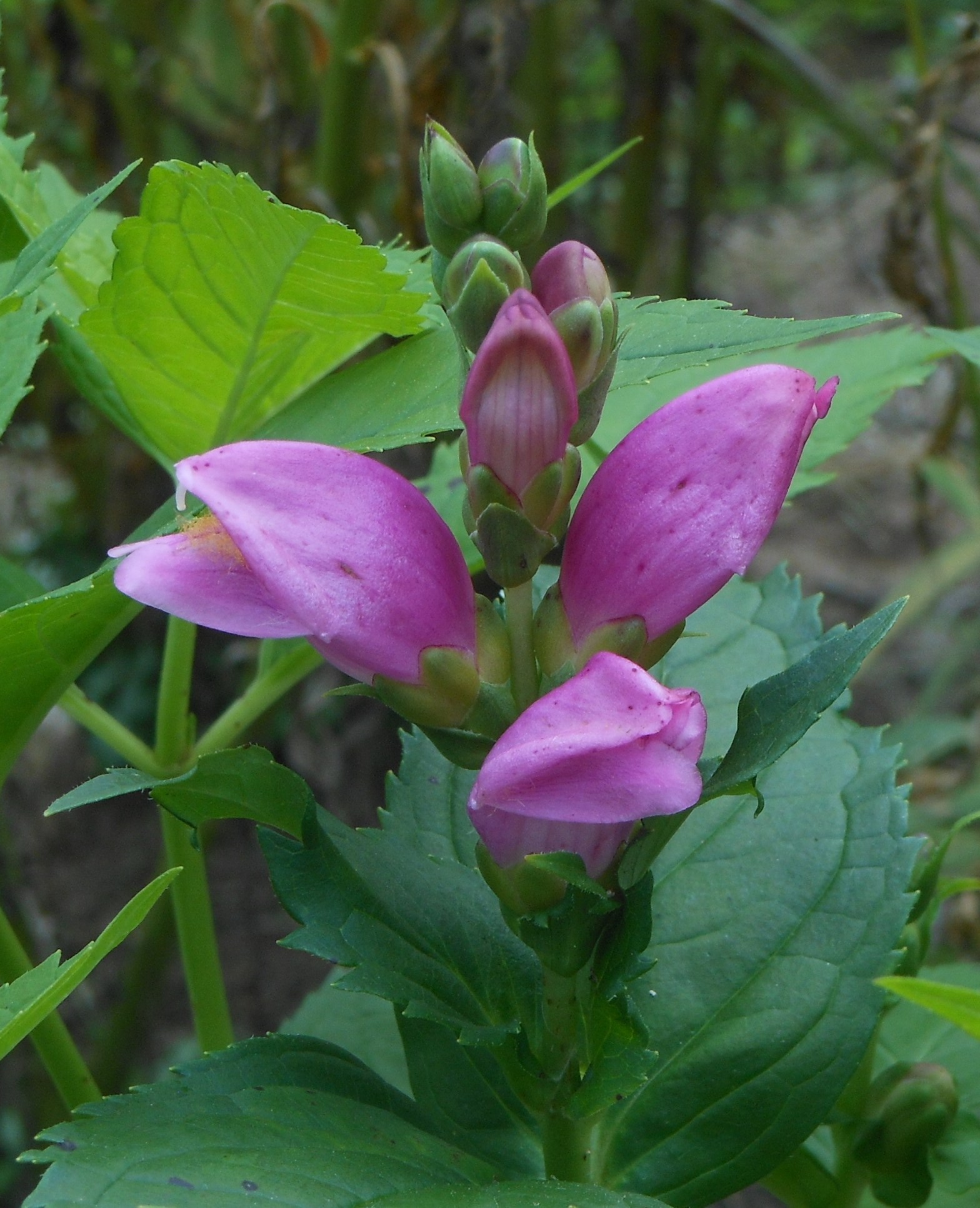 Pink Turtlehead is showier as a garden flower than is White, not only because of the colour but also because it often has more flowers open at once on a stalk. It is also a bit shorter and less dependent on constant moisture, although it too does like a moist soil. If you have an appropriate spot for White Turtlehead, do plant several for the Baltimore Checkerspot butterflies, but you might also like to include some Pink Turtlehead in a nearby flower border, to provide additional food resources for the larger caterpillars.