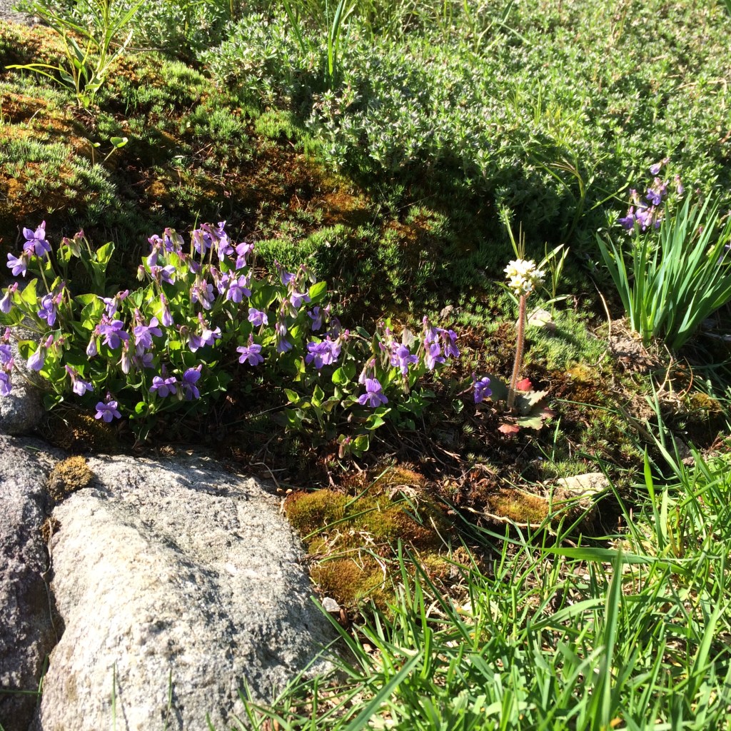The Rock Garden at Beaux Arbres in early spring: Common Bluets, violets, and some Moss Phlox.